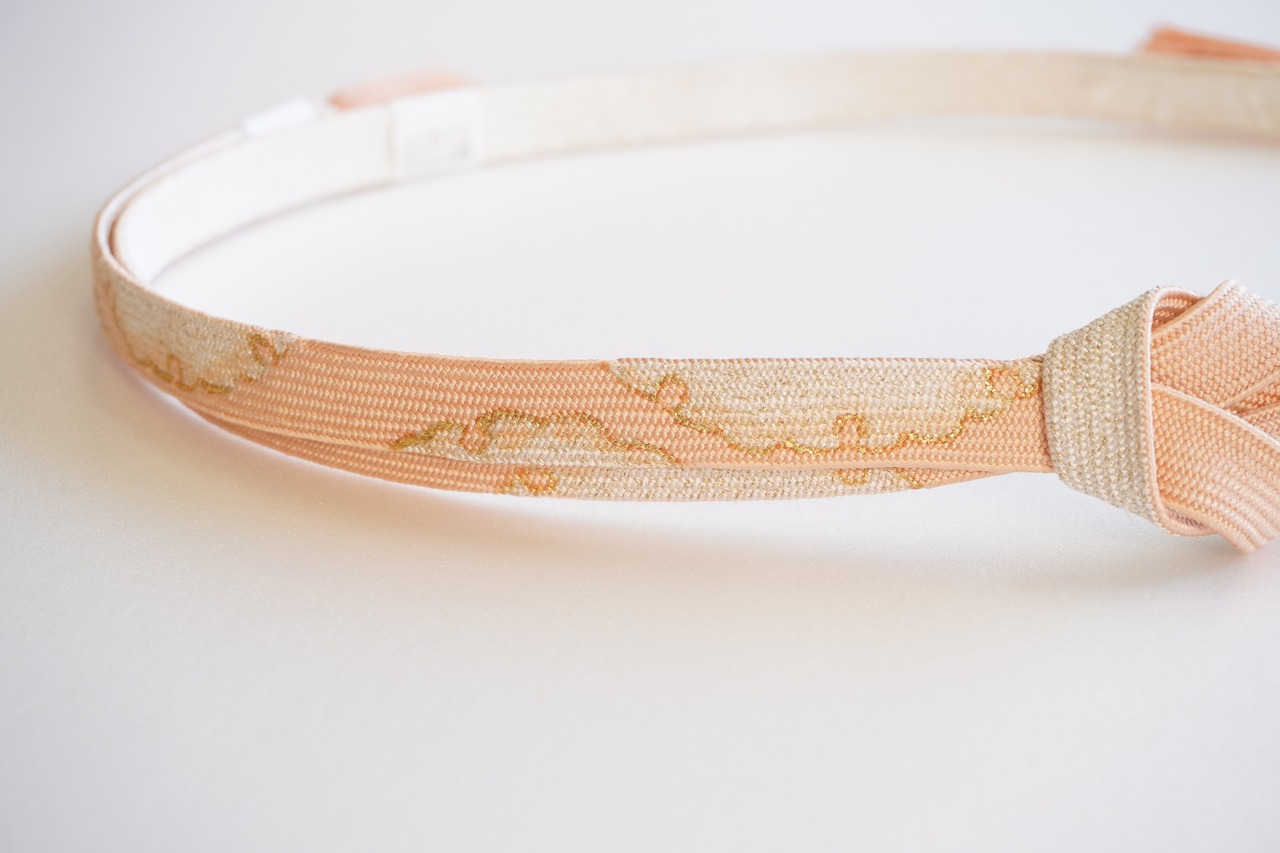 赤香色に雪輪の文様が施された帯締めです。