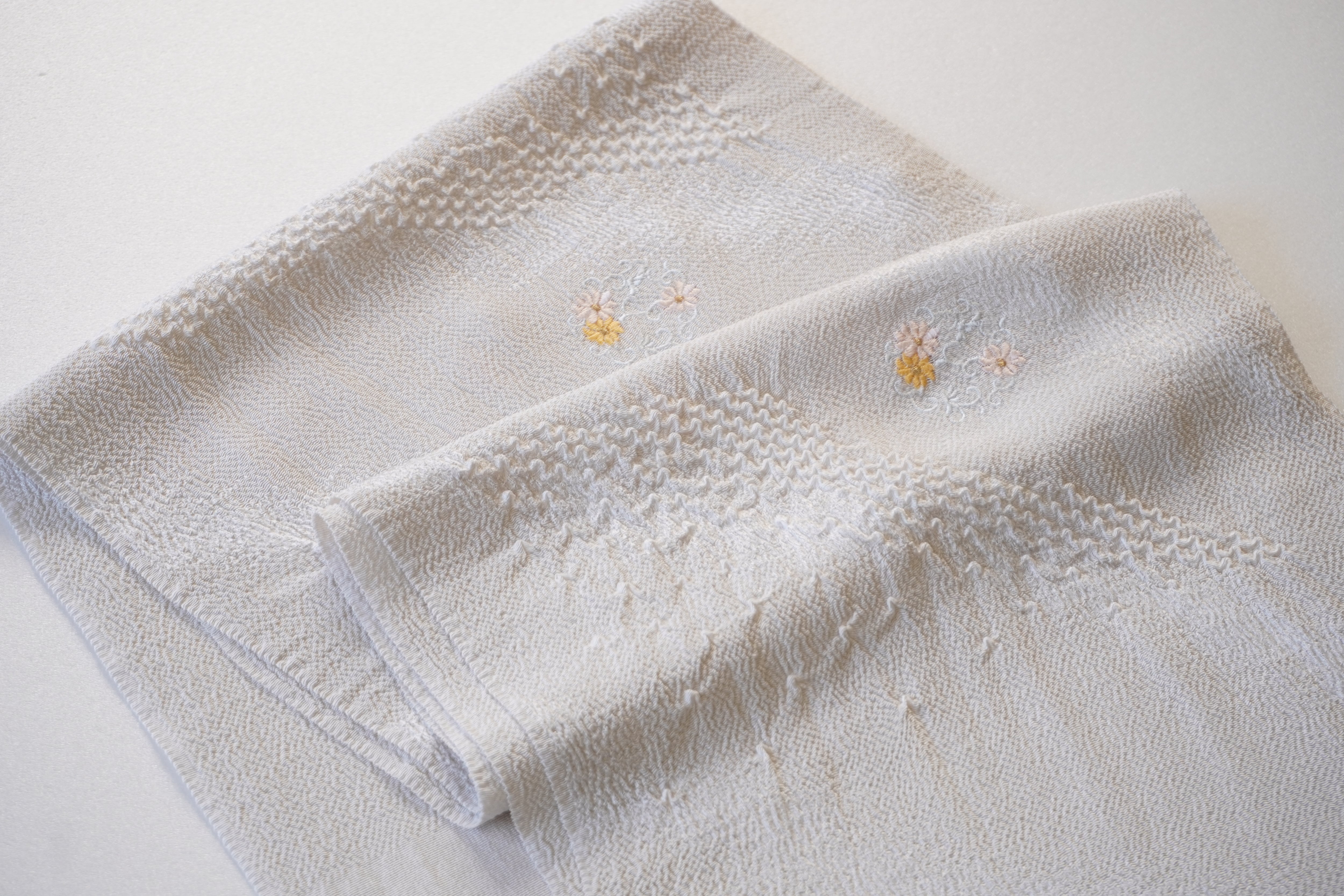 ちりめんの生地に絞りと花輪の刺繍が