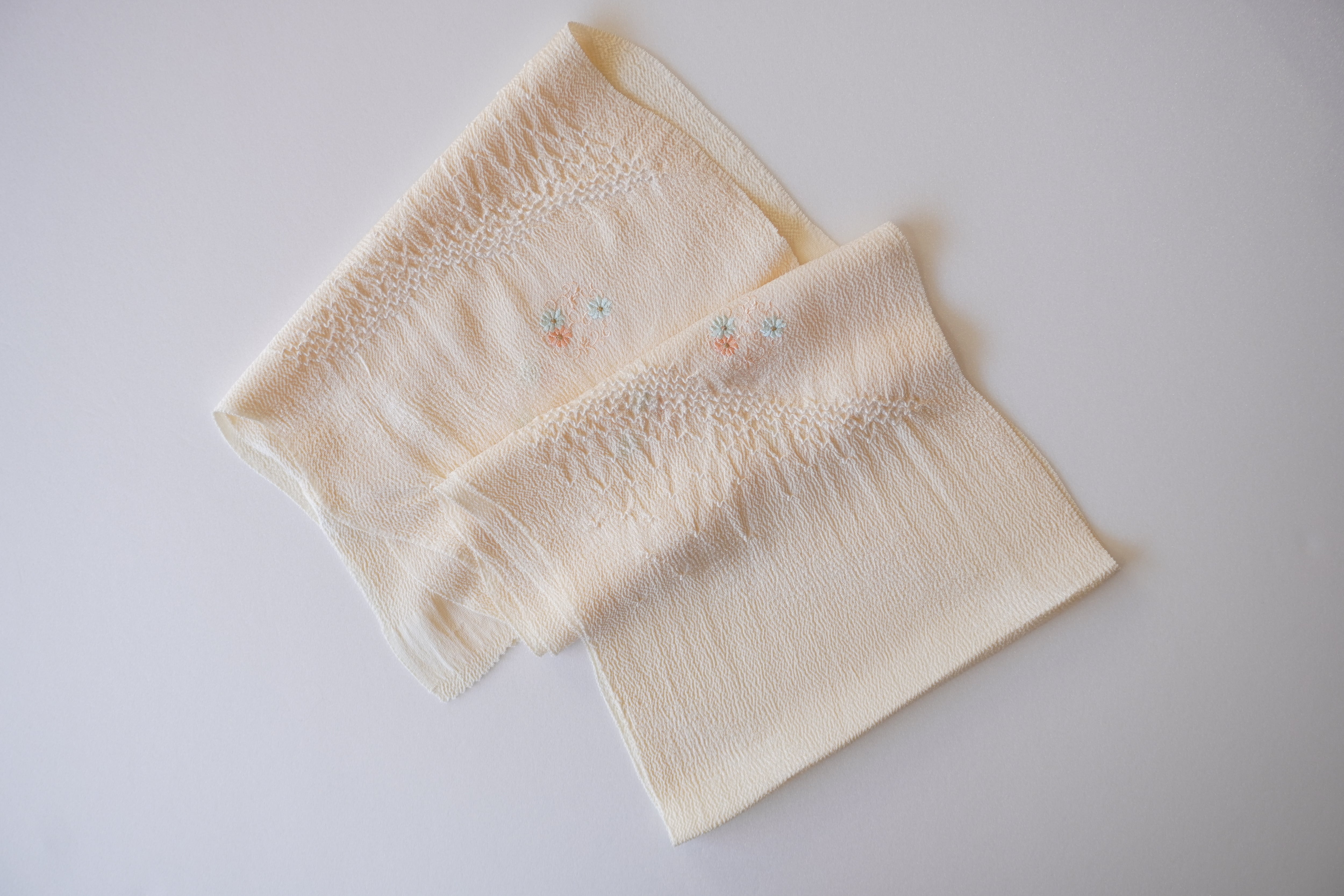 ちりめんの生地に絞りと花輪の刺繍が